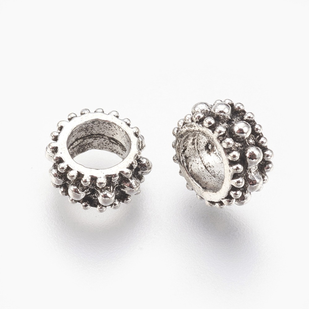 These spacer beads offer both style and function. The textured antique finish adds character, while the large hole allows for versatile use in modern jewellery designs.