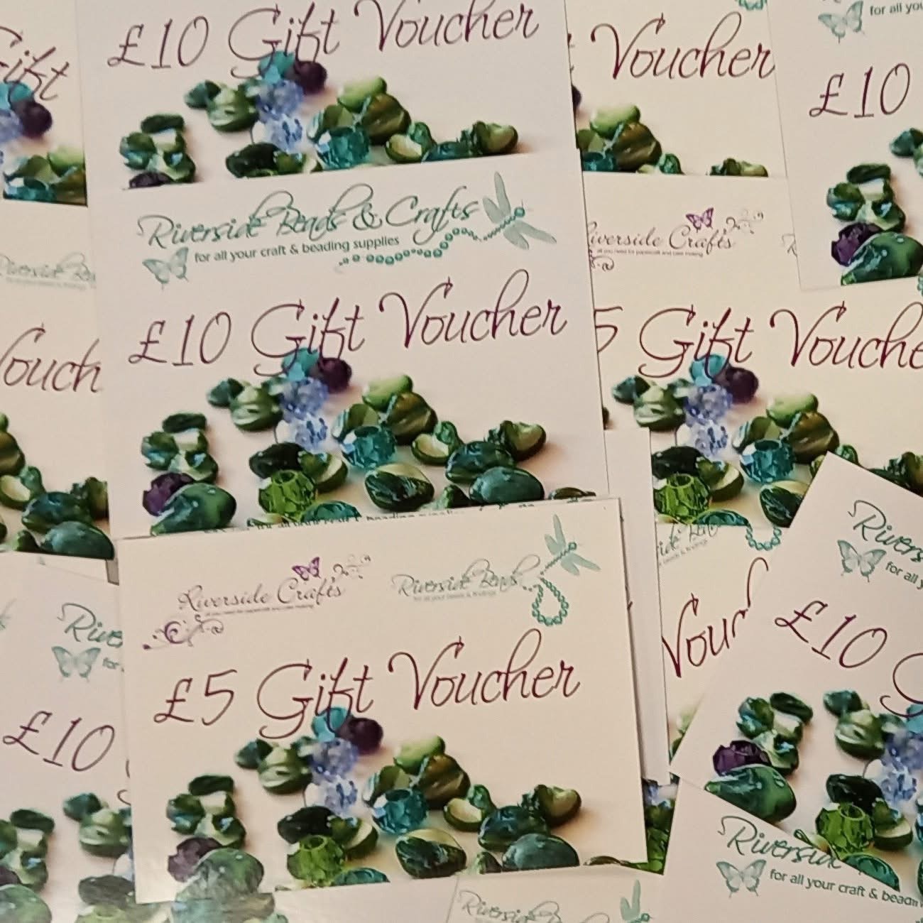 Our Riverside Beads Gift Voucher are available in £5 or £10 amounts. We have the option to select in store or online vouchers. Instore vouchers can be collected or posted to you (postage charges apply) online vouchers will have a 1 use code sent which you can pass on to the receiver as an e-vouchers.